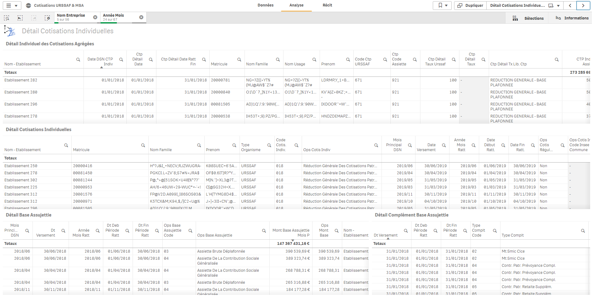 L’application se décline en multiples feuilles permettant de visualiser les informations contenues dans la DSN concernant les éléments de cotisations MSA.