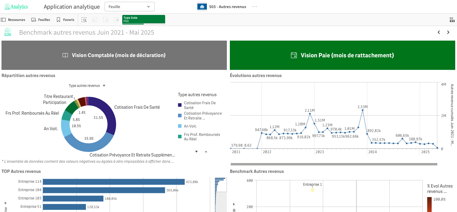 Analyse des types d'autres revenus via des répartitions et benchmark selon différents