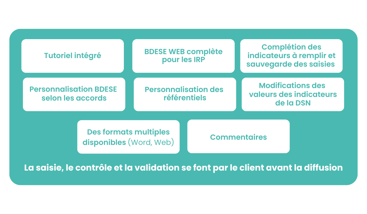 Ce produit permet de générer automatiquement une Base de Données Economiques, Sociales et Environnementales (BDESE) complète au format Word ou Web, préremplie entre 50 et 60 % indicateurs sociaux quantitatifs en fonction de la taille de l’entreprise (-300 Salariés, +300 Salariés), respectant l’organisation définie aux articles R2312-9 et R2312-8 du code du travail avec :