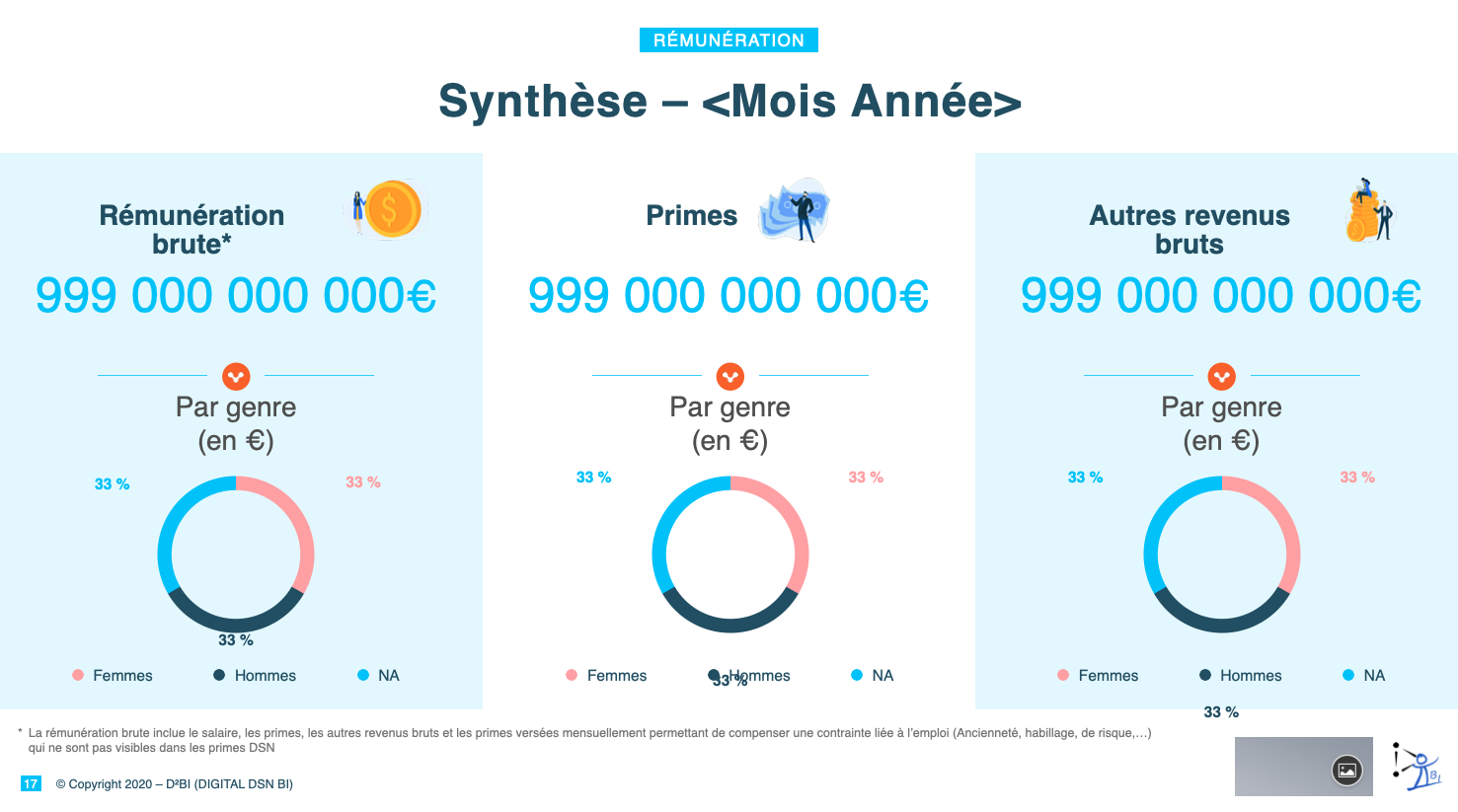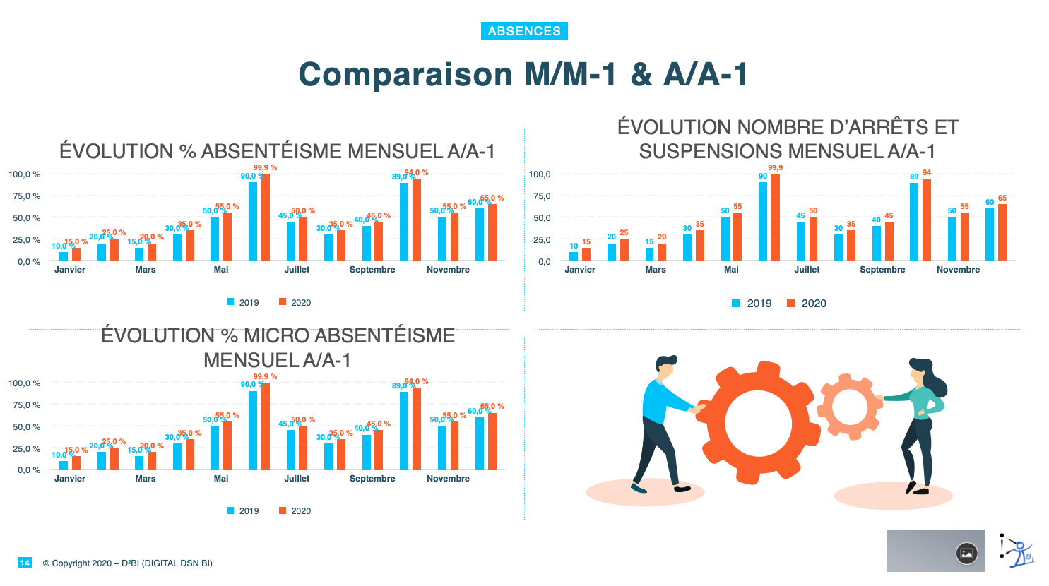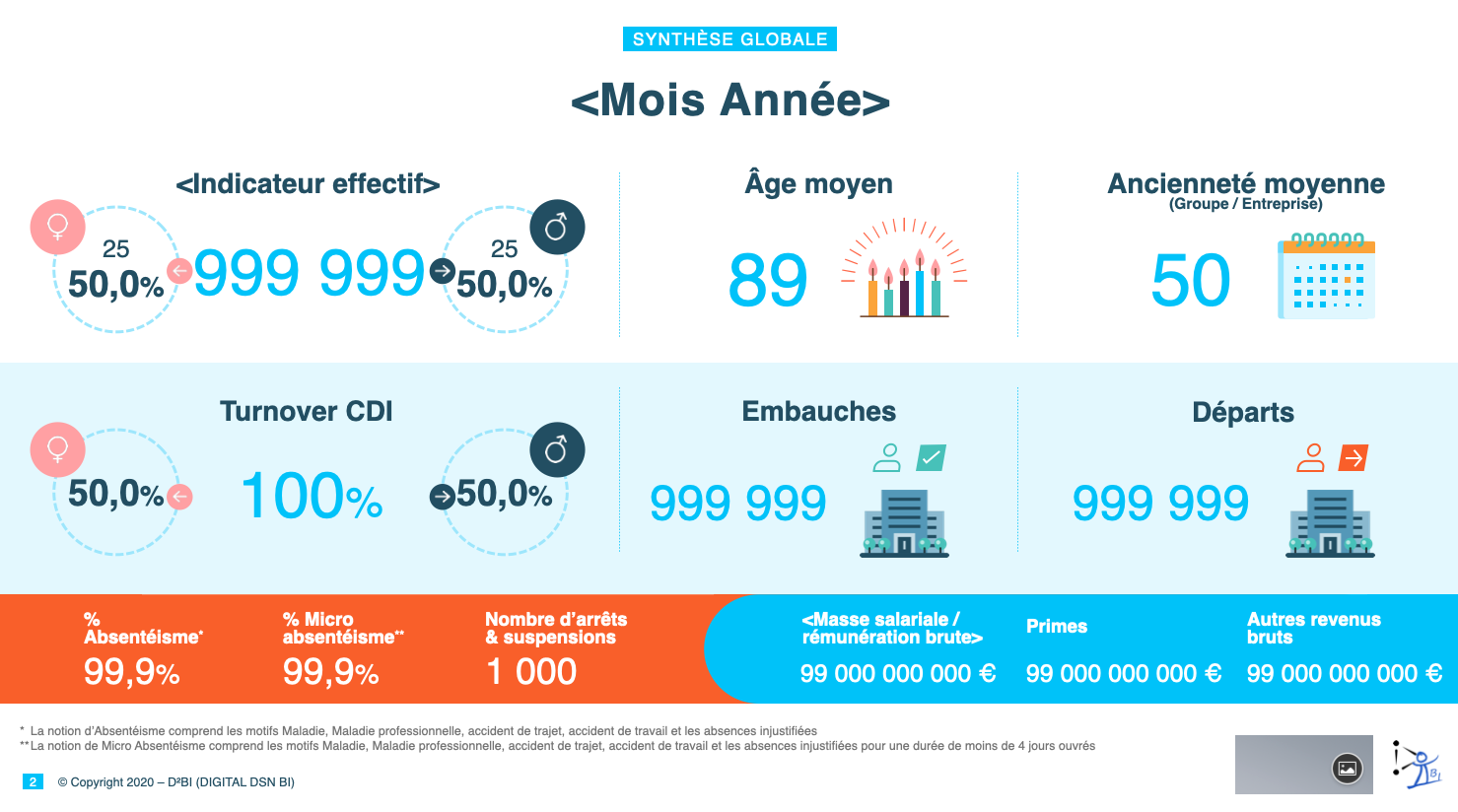 Générer automatiquement un rapport complet au format PowerPoint (PPTX), prérempli avec des indicateurs sociaux quantitatifs permettant d’avoir un suivi mensuel de l’activité dans l’entreprise à partir de 4 thématiques :
