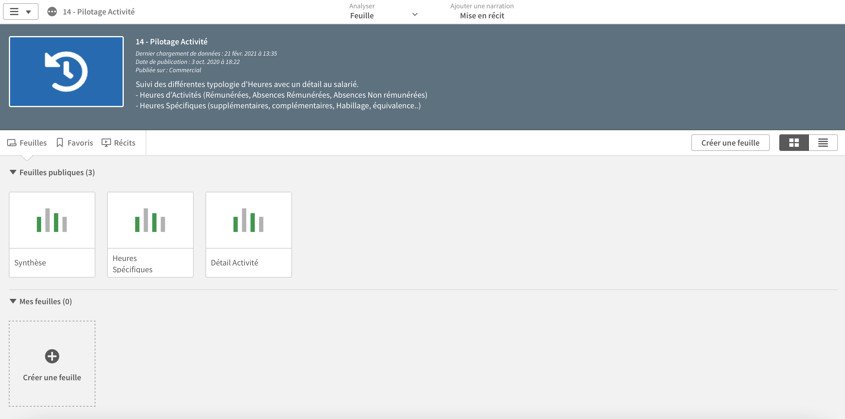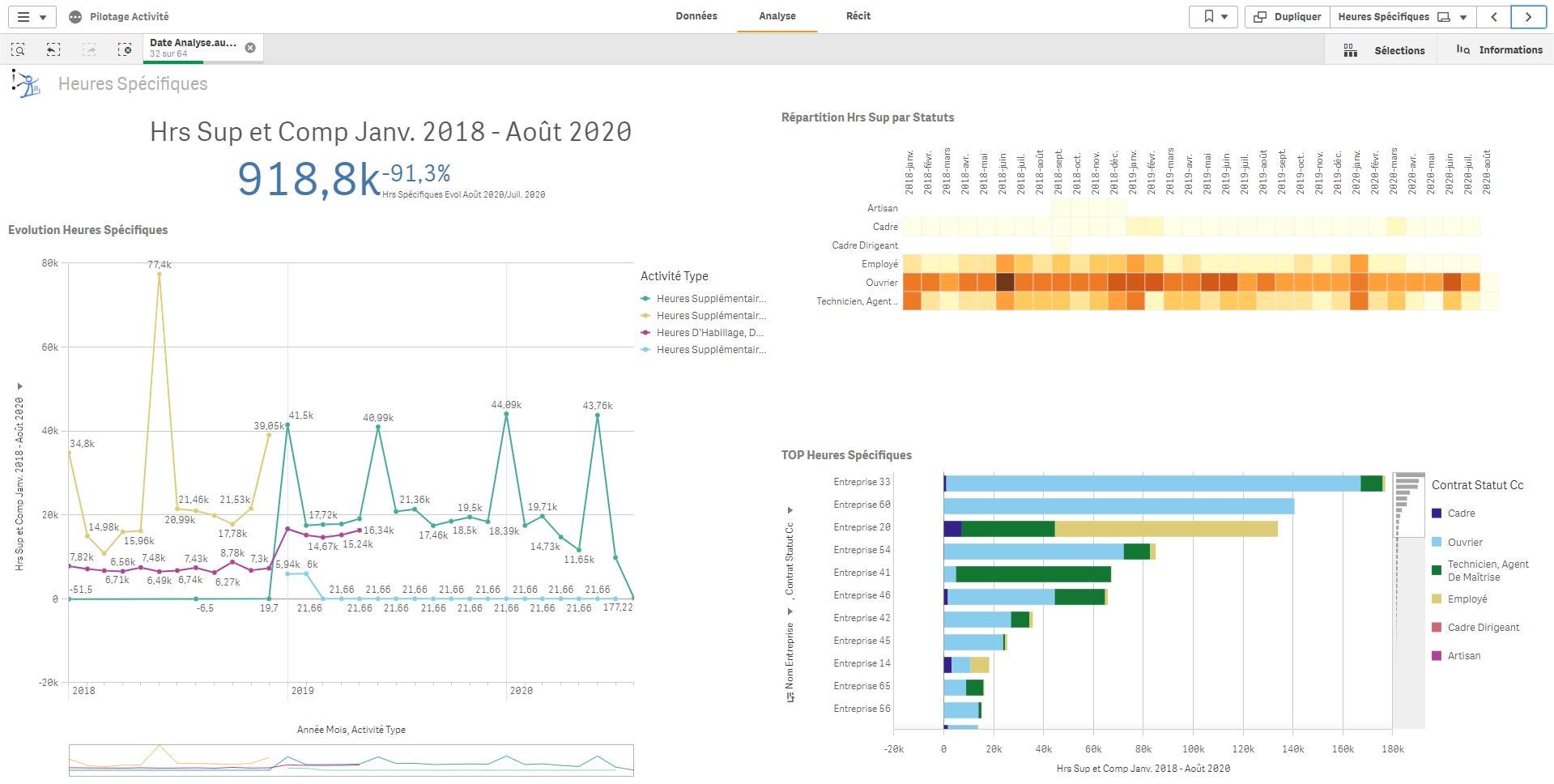 L’application se décline en multiples feuilles permettant de suivre l’activité en heures et en jours (heures rémunérées, supplémentaires, complémentaires…) :