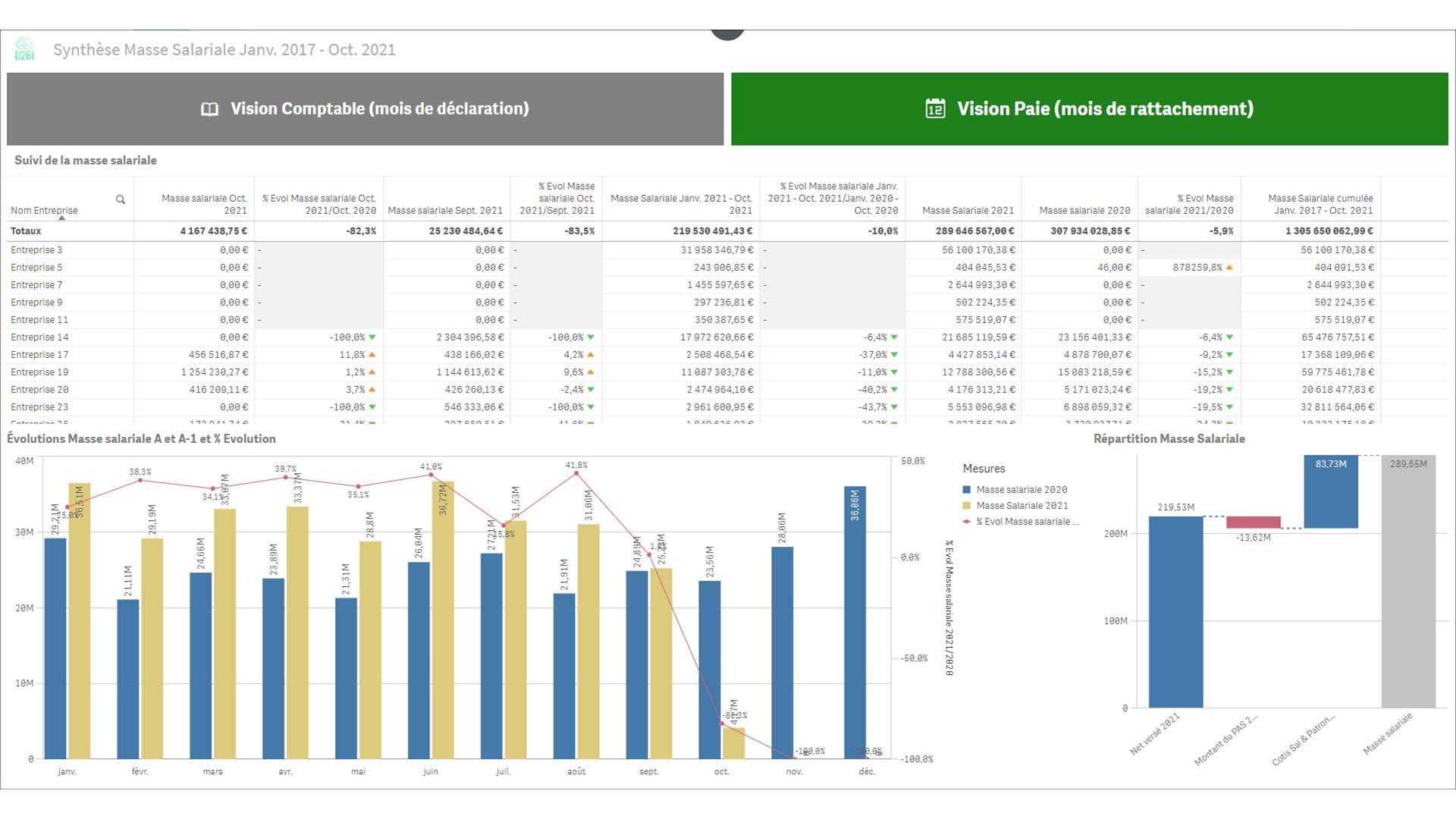 Vision synthétique de l'évolution de la masse salariale et des comparatifs M, M-1, YTD,